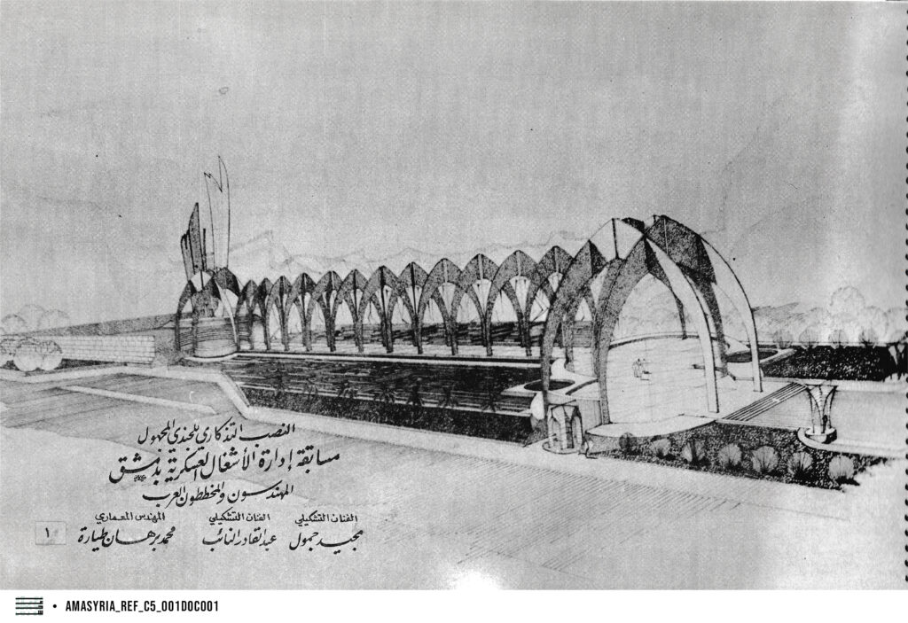 الاسم الرسمي: مقترح النصب التذكاري للجندي المجهول بدمشق - جائزة المركز الثاني المعمار: برهان طيارة المشاركون: الفنان مجيد جمول، الفنان عبد القادر النائب المكتب: المهندسون والمخططون العرب الزبون: وزارة الدفاع السورية السنة: 1980 المدينة: دمشق، سوريا استعمال المبنى: ضريح، متحف الحالة:مقتَرَح مسابقة الفريق: غير معروف