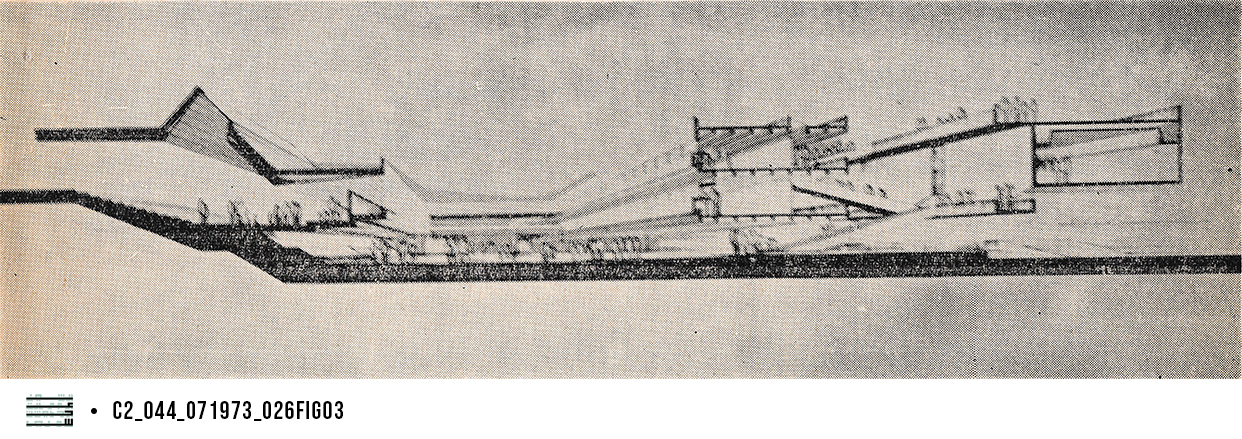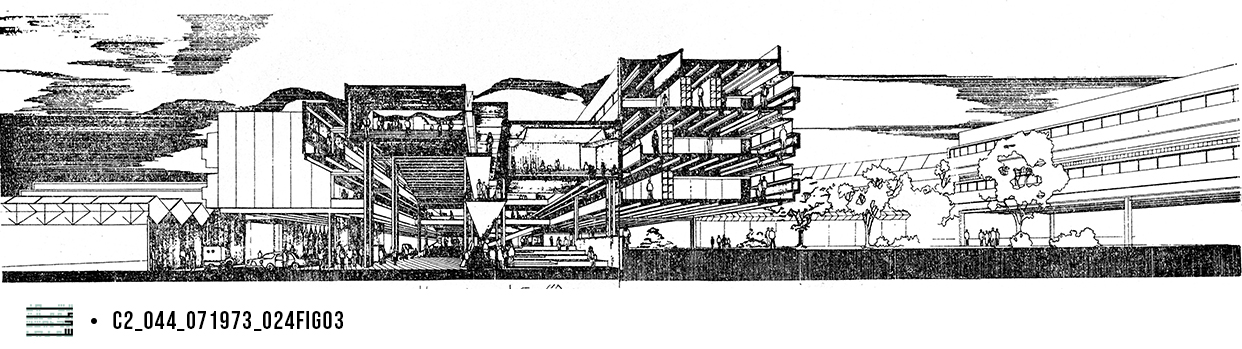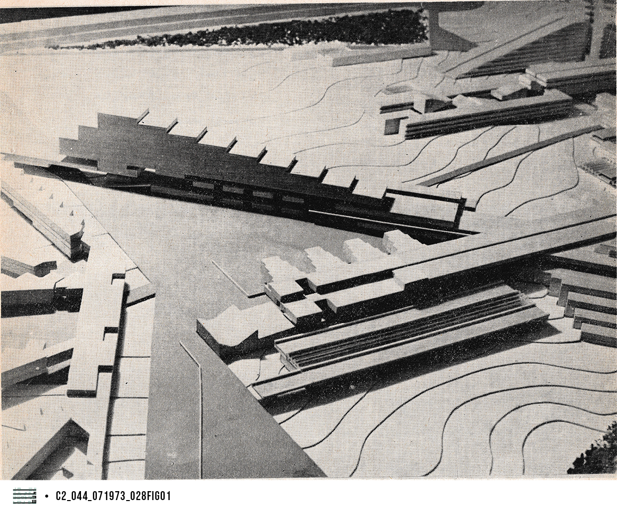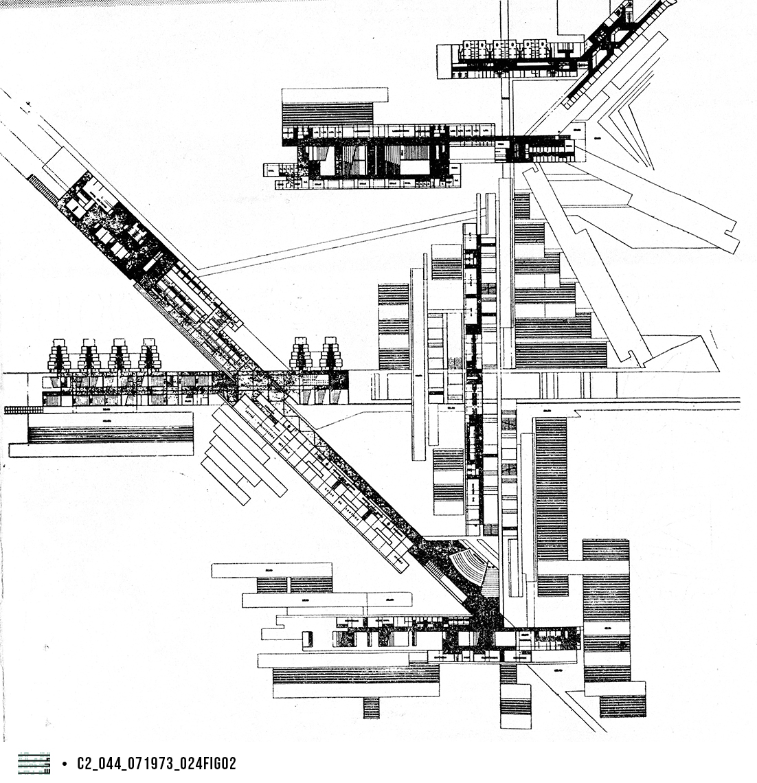 In his proposal, Ciamarra conceived the university as a “system of places,” organized along pedestrian axes that intersect with the classrooms both above and below, which he identified as the most heavily used spaces. This design aims to eliminate any distinction between circulation areas and functional spaces. The university forms a continuous fabric of spaces of varying sizes and dimensions, both open and covered, where activities take place on multiple levels, without being reduced to mere buildings and façades. It incorporates a “fourth dimension” of design, allowing the configuration of activities to adapt in response to changes in the educational system.01 According to Ciamarra, although the university functions as a neighborhood within the city, its architectural treatment differs from that of residential areas, a distinction reflected in his design.02 He also noted that the establishment of the university would reshape the city’s urban plans, while potentially preserving the site’s original distinctive characteristics.03