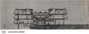 The laboratory buildings are designed on two levels separated by a 3-meter-wide beam, which serves as a walkway and supports thermal, electrical, pneumatic, and hydraulic equipment, and is equipped with openings for maintenance. The central columns were also split in half to allow for the passage of drainage pipes connected to the laboratory roofs. Two solutions were proposed for the roofs of the laboratories: the first employed a 45°-angled steel mesh structure, with the southern sections covered by insulating panels and the northern sections with colored tempered glass; the second used reinforced or prestressed concrete, with the northern sections entirely glazed. The covering elements rest on prefabricated beams 12 meters long, spaced at the same intervals, and include channels for rainwater drainage into pipes integrated within the central columns.
